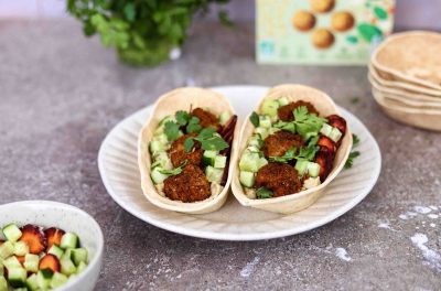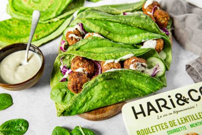 Temps de préparation : 15 minutes Temps de cuisson : 7 minutes Quantité : 2 personnes > INGREDIENTS : 2 tortillas 1 pack de nos boulettes de lentilles vertes 2…