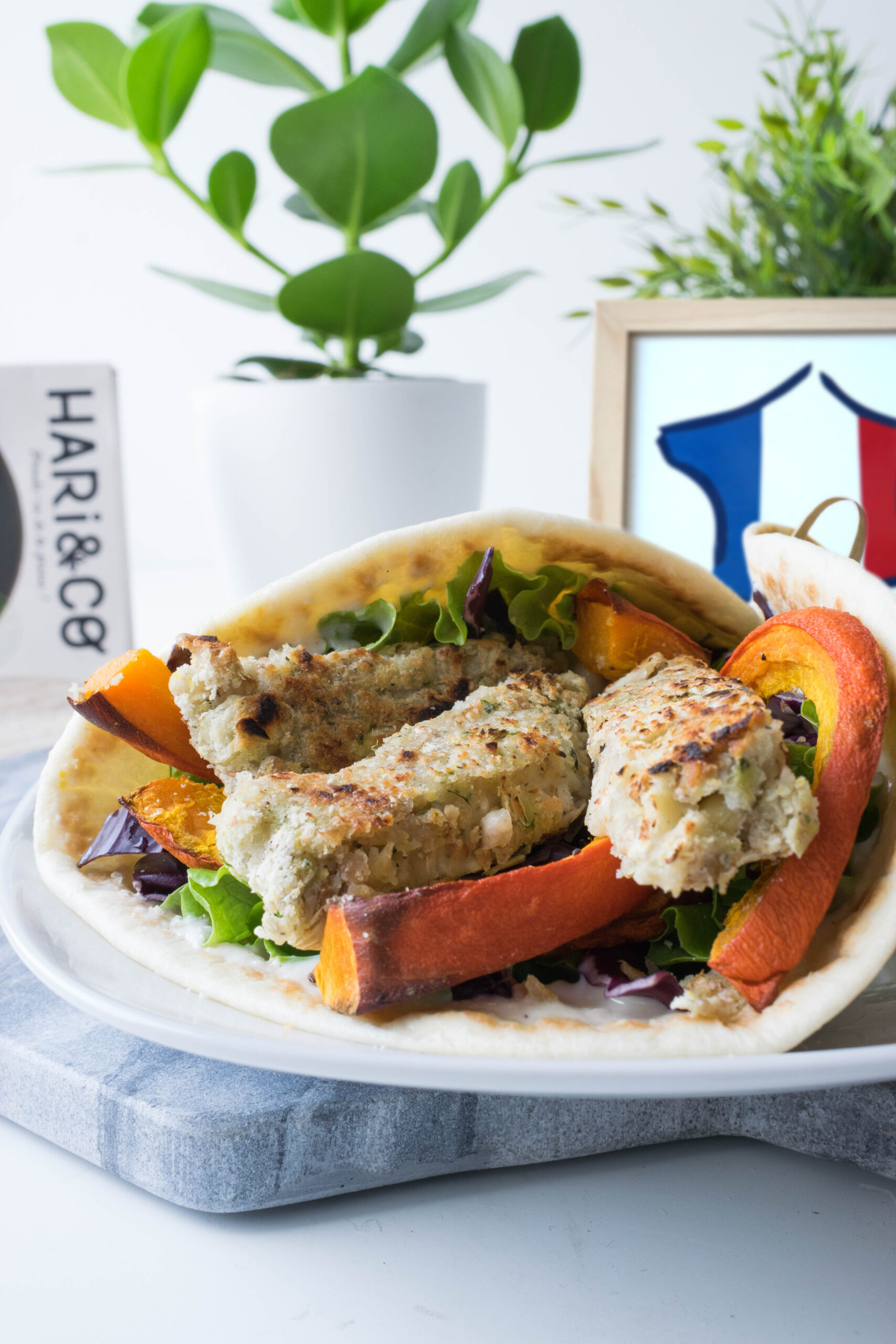 Mettre de la sauce à base de purée de sésame sur votre wrap puis disposer des morceaux de potimarron rôti, du chou rouge, de la salade et une galette de Haricots flageolets HARi&CO.