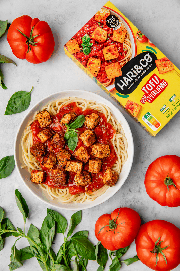 3. Ajouter dans la poêle le tofu à l’italienne HARi&CO découpé en dés, le coulis de tomates, les herbes de Provence, laisser mijoter.