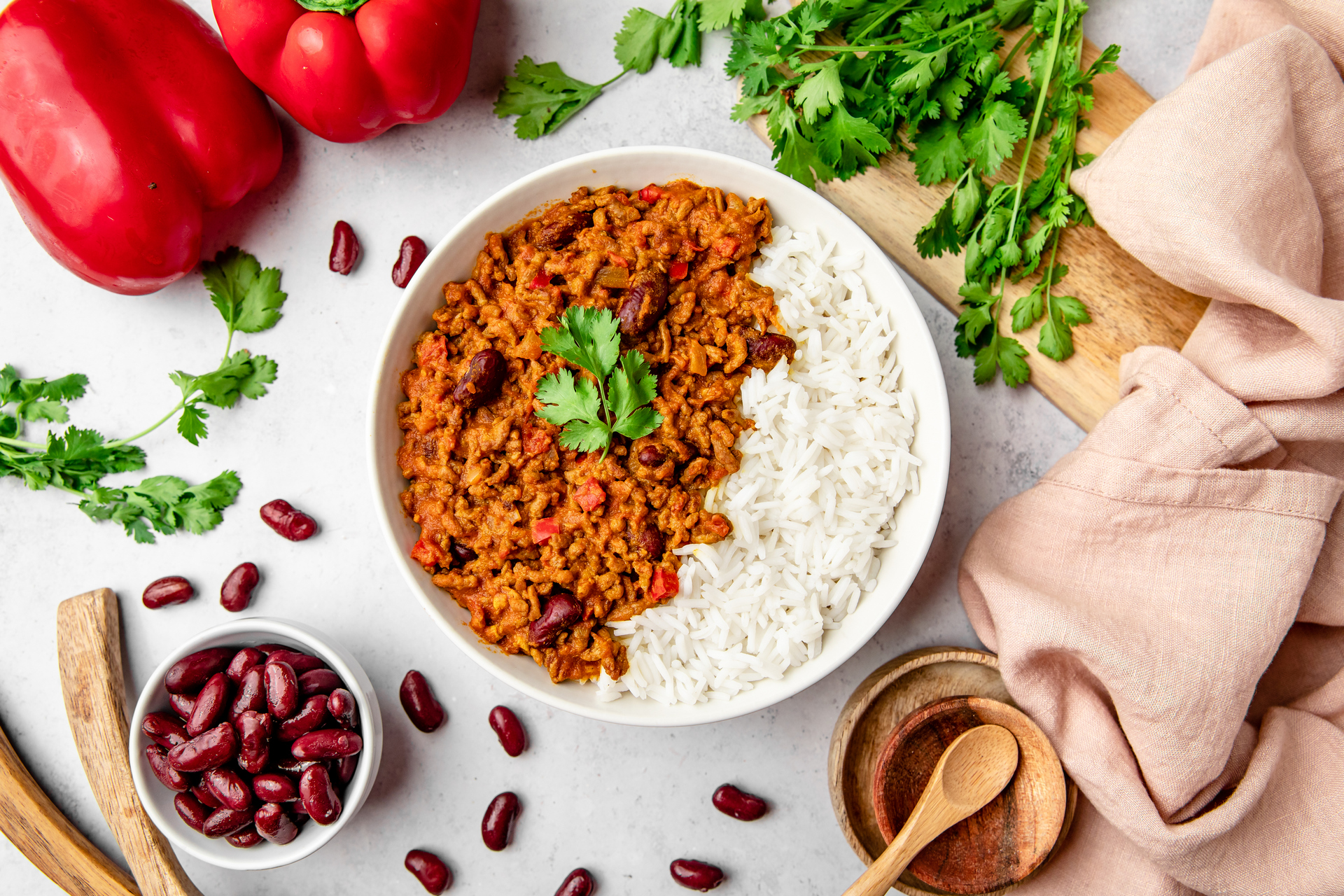 Riz cuit* (35%), pulpe de tomates au jus (18%) (tomates*, jus de tomates*), haricots rouges* (12%), eau, poivrons rouges* (6%), oignons* (3%), protéines de pois texturées* (3%), double