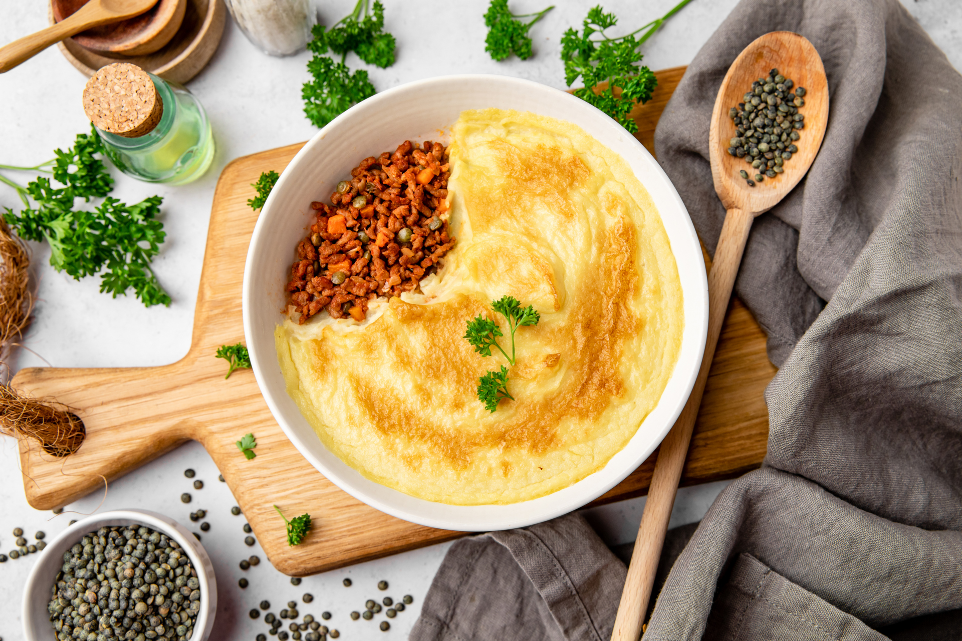 Pommes de terre* (39%), eau, pulpe de tomates au jus (12%) (tomates*, jus de tomates*), oignons* (6%), lentilles vertes cuites* (6%), protéines de pois* texturées (4%), carottes* (3%), huile d’olive vierge extra*, huile de tournesol*, concentré de tomates*, amidon de maïs*, sel, purée d’ail*, basilic*, persil*, piment doux fumé*, poivre*, curcuma*.